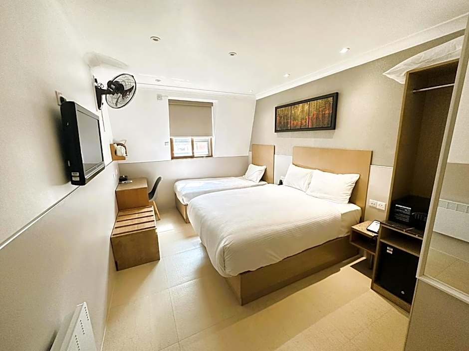 The Eurotraveller Hotel- Express (Elephant & Castle) offers a variety of rooms including triple, double, family (4 adults), twin, and single rooms. Smoking is not allowed in any of the rooms. Triple rooms have one twin and one double bed, accommodating up to 3 adults and 2 children. Family rooms have two twin and one double bed, accommodating up to 4 adults. Twin rooms have two twin beds and accommodate 2 adults. Single rooms accommodate 1 adult with a twin bed. The sizes of the rooms range from 65 sqft to 129 sqft.