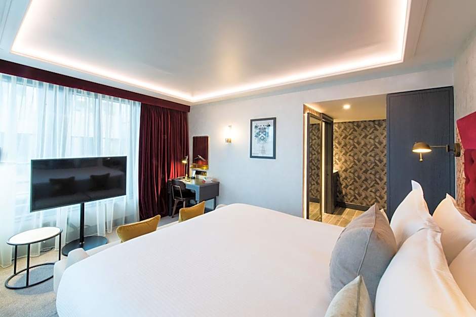 This room has a king-size bed with a velvet headboard, an armchair, a Nespresso coffee machine, a LED TV and media hub with movies-on-demand and Marshall speakers.