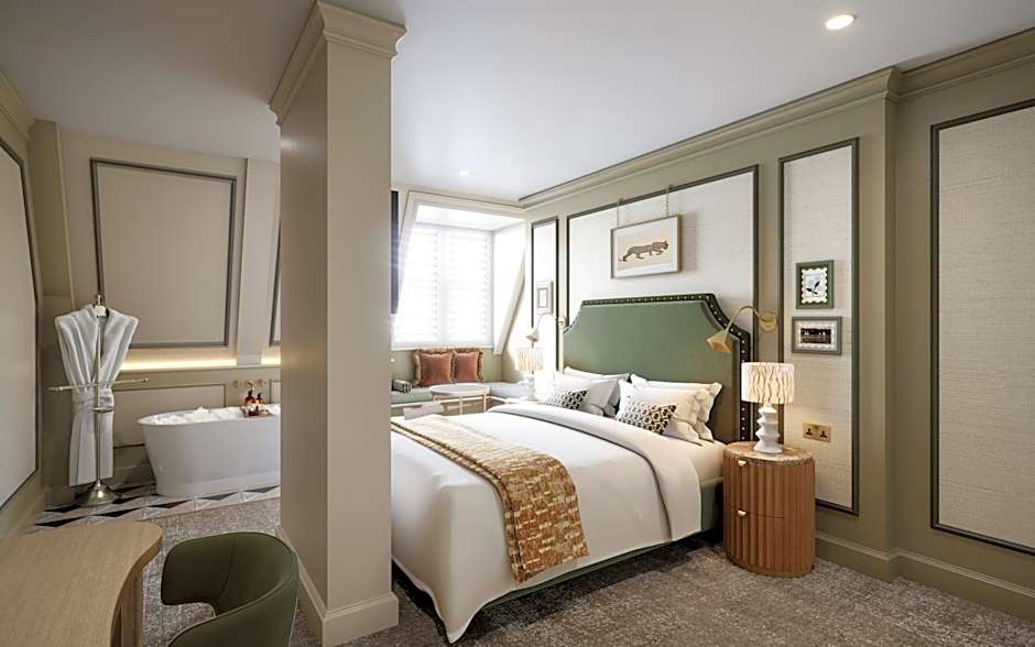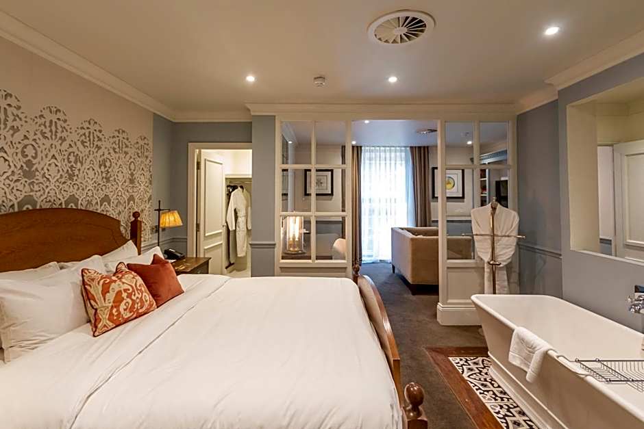 Junior Suites are located on the 2nd floor and vary in size between 38 and 40 square yards. The suites feature an open-plan design with a bedroom and lounge area with luxury furnishings. They have a Super king size bed with luxury double pocket sprung mattress, and a free standing bath located in the bedroom. The lounge area offers a large wall-mounted TV and floor level windows showcasing the original cast-iron railings.