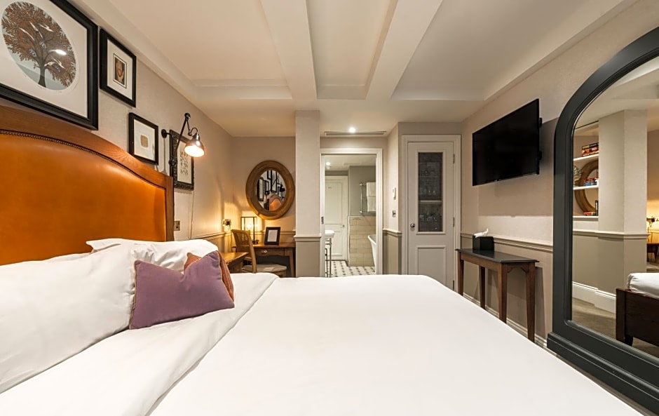 These rooms are eclectic in design pairing muted tones with designer wallpaper and luxurious fabrics. They vary in size between 27 and 32 square yards. The rooms feature Super king-sized double pocket sprung mattress, goose down feather pillows, crisp white linen, working desk area and soft furnishings paired with bespoke furniture. The private bathrooms include a walk-in rain shower and free-standing bath, free toiletries and bathrobes. Some rooms have a walk-through en-suite, with a sliding door to the bedroom.