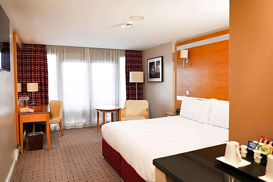 Daytime stadium views, complimentary WiFi, LCD HDTV, desk, stylish bathroom While the king-sized bed takes center stage, the daytime view over StadiumMK is surely a close second. The room is fitted with a wall mounted LCD HDTV, alarm clock, desk, electronic safe and mini fridge (un-stocked). Complimentary WiFi in the comfort of your room is standard. The modern private bathroom comes complete with ample vanity space, a bath with overhead shower, plus body and bath products. This room, along with all rooms at the DoubleTree by Hilton Milton Keynes, is a nonsmoking room. Guests are unable to view any events or matches from inside this bedroom