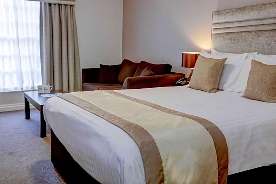 Features in this room include a king size bed, a sofa area with coffee table, 32-inch flat-screen TV with Freeview and tea/coffee making facilities. The private bathroom comes with a bath and overhead shower and complimentary toiletries. Bottled water, iron and ironing board and a hairdryer and complimentary WiFi are also provided.