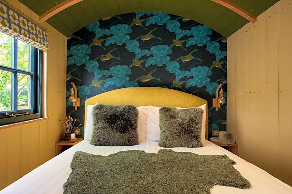 The Family Woodland Suites are bespoke luxury Shepherd Huts that have been have individually designed and decorated. They feature a double bedroom, a separate en suite and shower and a dining table that converts to the children's double bed. The living room area consists of a cozy seating space area with a wood burning stove and a kitchenette.