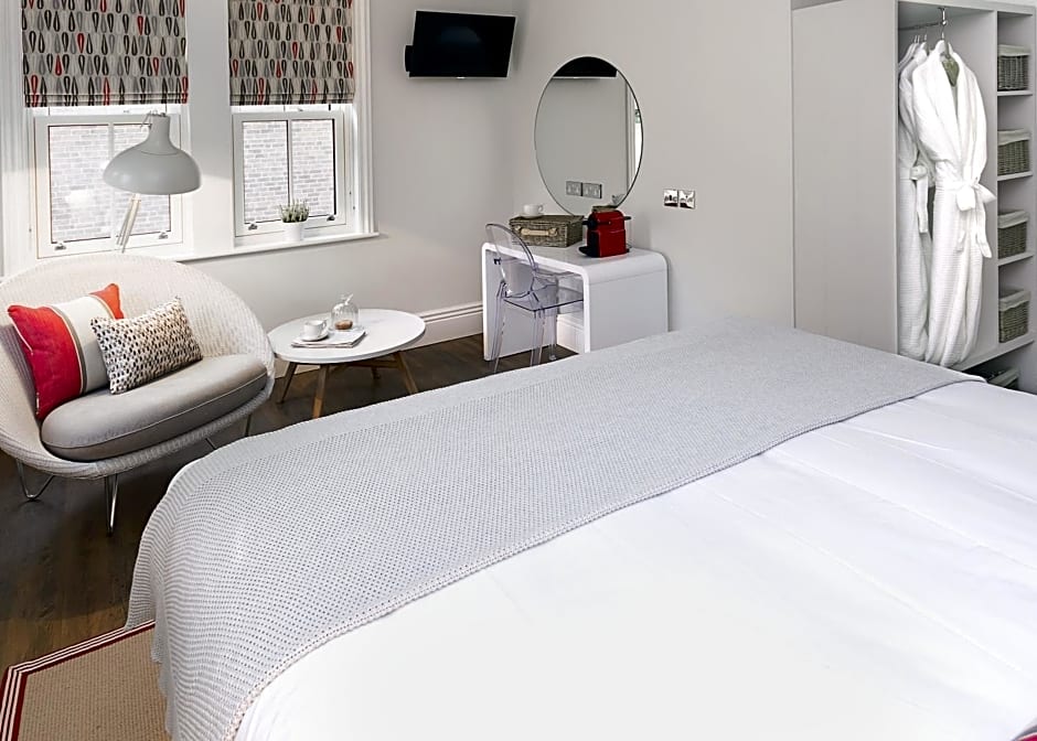 Set on the top floor, The Dovecote is Brocco’s signature bedroom. This suite features a balcony, with views overlooking the park and town. Guests can enjoy original art on the walls. The private bathroom features a monsoon rain shower and a freestanding luxury copper bath. The room features a king-size bed.with a pocket-sprung mattress, and luxurious cashmere and wool bedding. Included in the suite is LED mood lighting, an Allegra Hicks love seat, a Smart TV, a Roberts radio, a Nespresso coffee machine, and free WiFi.