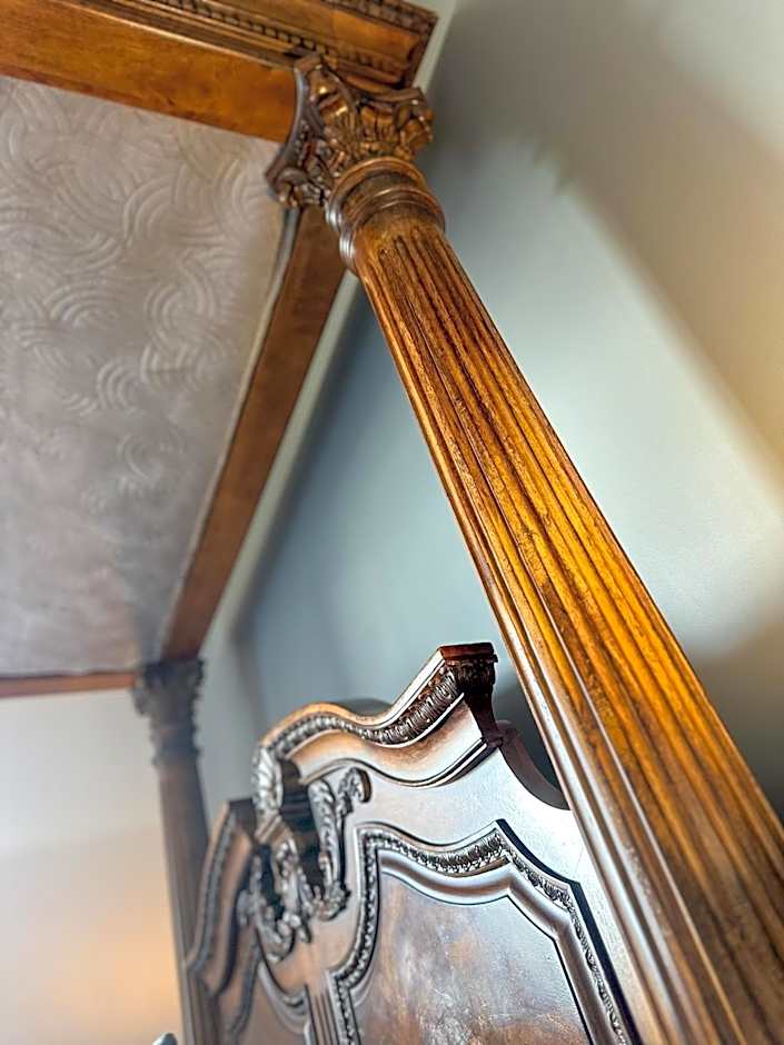 Spacious room with a king-size four-poster bed, seating area and scenic views.