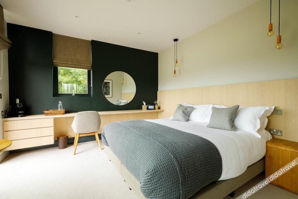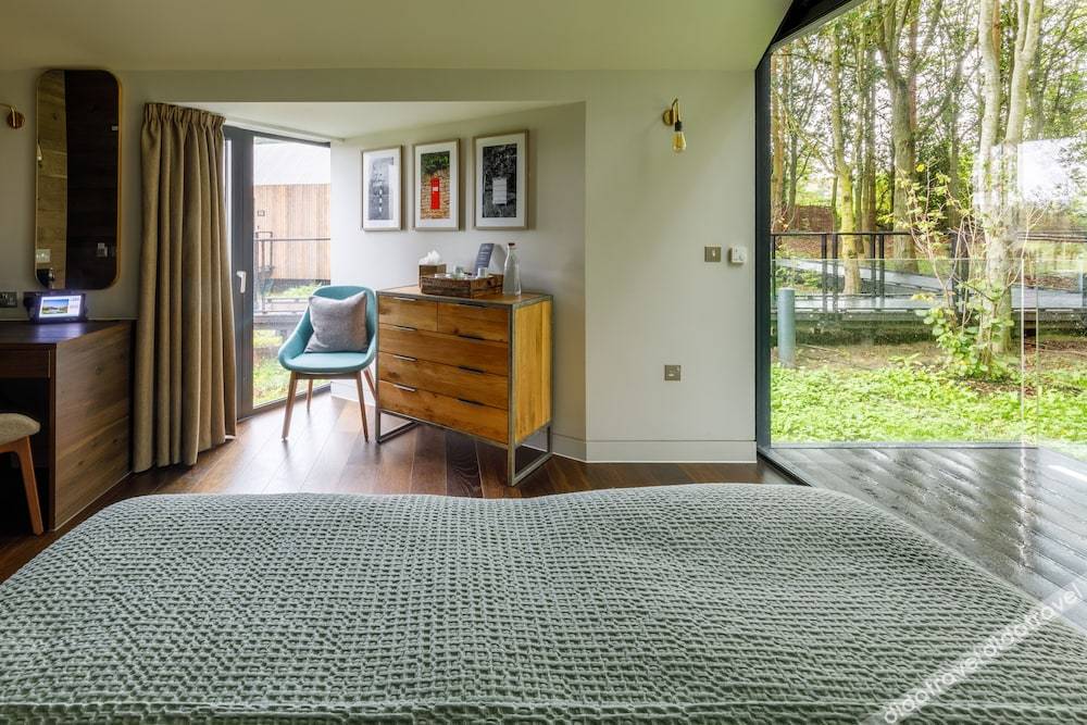 This double room has a seating area, soundproofing and electric kettle. Located on the northern side of our individual lodges, rooms can be prepared as a king size or two single twin beds. The design of these rooms provide a window to the south with views of the woods and golf course beyond. Each room offers tea and coffee making facilities complemented with homemade biscuits. Towels and robes are included, and the room is serviced daily. Travel cots are available on request when booking (subject to availability), alongside a nappy bin, changing mat and towel. Dogs are welcome at an additional cost. A bed and bowl can be provided subject to availability.
