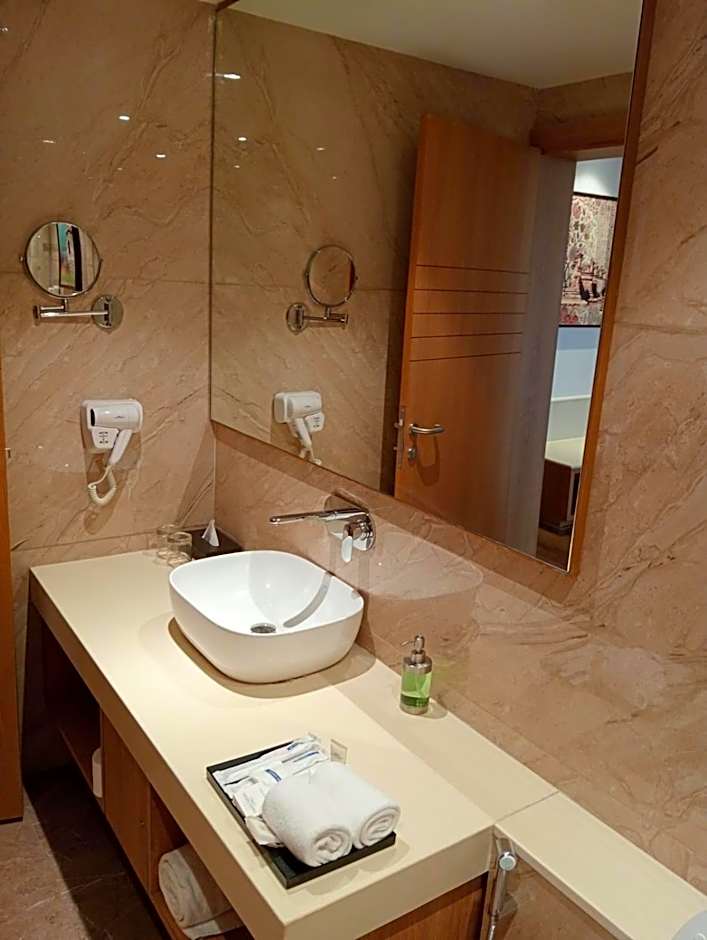 The Deluxe Suite features a separate living area. Special amenities include toiletries and use of bathrobes. These rooms also include a flat-screen TV, tea, mineral water, a combined bath and power shower, and free unlimited WiFi.