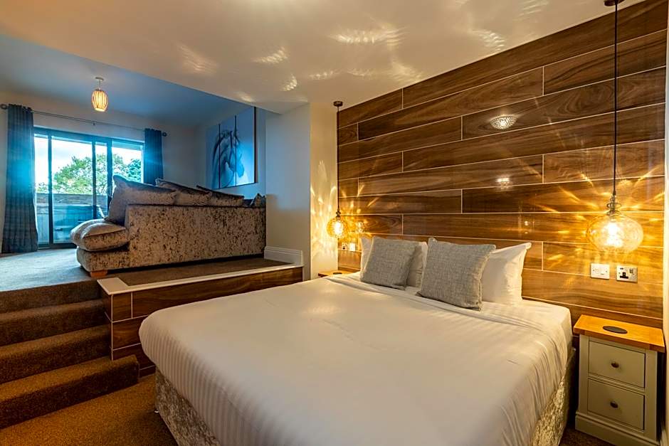 This adult only Suite offer a private balcony with a two person hot tub. Enjoy a bespoke floating super king bed and a lounge area with 48 inch TV on a mezzanine level where you can relax and unwind. These rooms look towards our spa and parking lot, they do not have a lake view.
