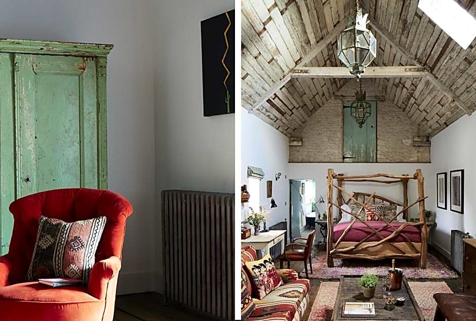 The Farmhouse Suite features original pitched ceilings and wooden floorboards, a spacious seating area and statement copper bathtub in the bedroom.