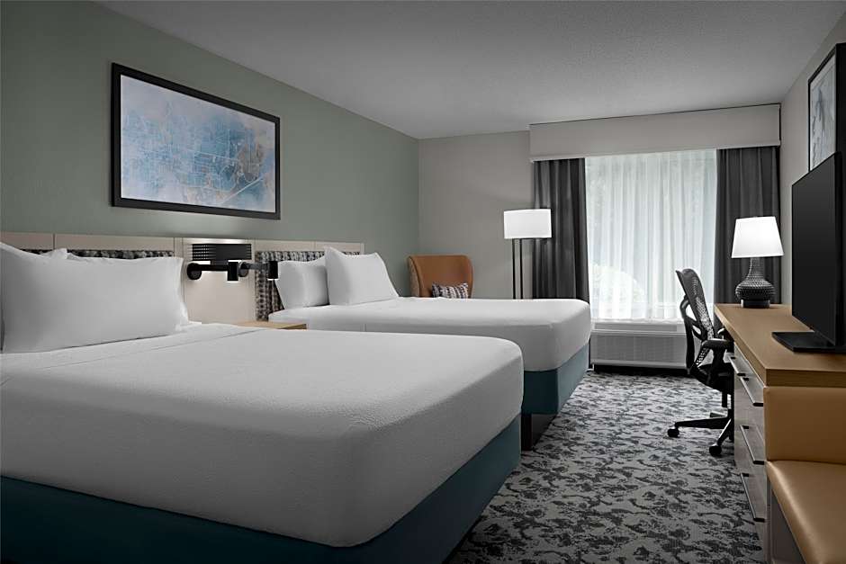 Sitting area, microwave, refrigerator, work area, 32-inch LCD TV, complimentary WiFi Experience comfort and convenience in this guest room featuring two queen-sized beds and a sitting area with an armchair and an ottoman. Catch up on work at the well-lit work desk with an ergonomic chair, desk-level electrical outlets and complimentary WiFi. Enjoy a 32-inch LCD TV with premium channels and an MP3 alarm clock radio to help you stay on schedule. The room offers home-like amenities, including a microwave, a refrigerator and a Keurig® coffeemaker.
