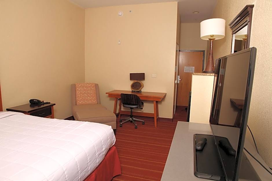 The hotel offers several types of rooms including Deluxe King Rooms, King Studio Suites, King Rooms, and Queen Rooms with Two Queen Beds. All rooms are non-smoking and have different occupancy limits ranging from 2 to 4 adults, with options to accommodate children as well. The bed sizes vary, with options of King size beds in all room types and Queen size beds in the Queen Rooms.