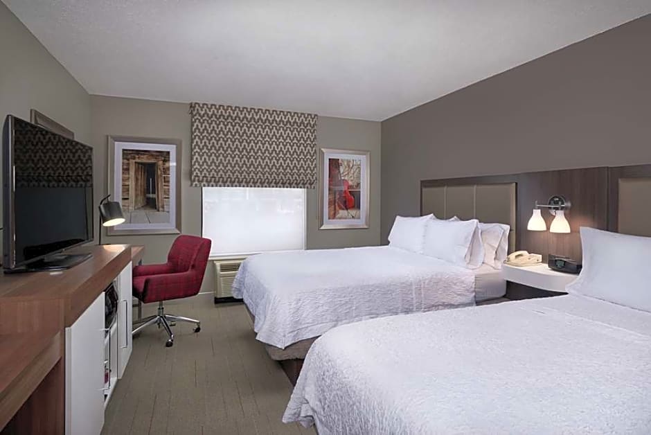 Work area, 32-inch LCD TV, tea/coffeemaker, WiFi Settle into this guest room and enjoy a restful night's sleep in one of the 2 queen-sized clean and fresh Hampton beds®. Unwind before the 32-inch LCD TV and enjoy a hot beverage from your in-room tea/coffeemaker. The room ensures your productivity thanks to a spacious work desk and WiFi. There is also a modern bathroom featuring fluffy towels, a WaterPik® showerhead and curved shower rod for added space and comfort.