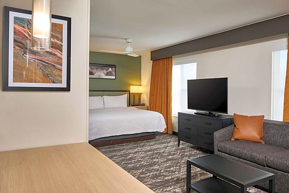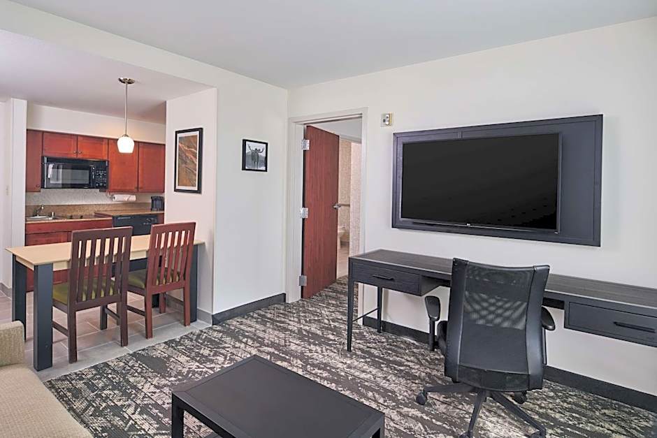 This hearing accessible non-smoking studio suite features one king-sized bed. This room also has a visual alarm and notification devices for the doorbell or door knock and incoming telephone calls. This suite has a kitchen built to lower scale with full-sized refrigerator, microwave, dishwasher and twin burner stove - plus utensils - to make dining in easy. For added convenience and flexibility, there is a HDTV, a full-sized sofa bed as well as an additional work table and chair, separate from the dining area table. This suite will keep you connected with complimentary high-speed internet access and telephone. Any corresponding photo may not reflect the specific accessible room type or room feature.