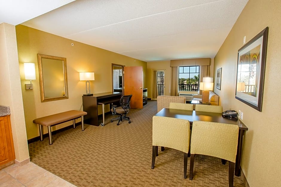 Unwind w your favorite program on our 32inch TV or impress yourself w our high speed internet. Our two room suites make guests feel at home with the full sized kitchen fridge and micro while also providing a businesslike atmosphere with a sizable desk. The jacuzzi tub and balcony add luxury.