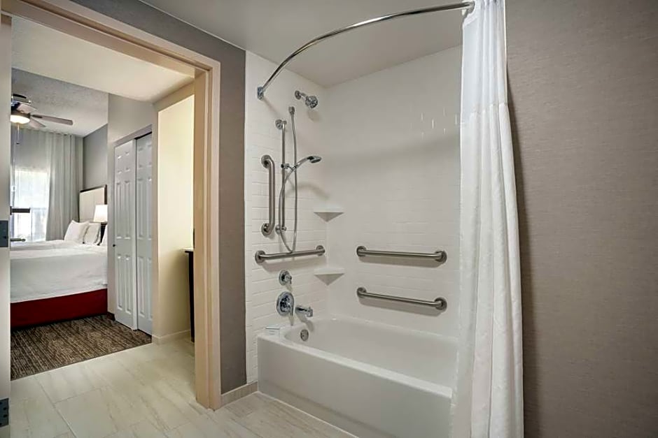 This mobility and hearing accessible non-smoking one bedroom suite features two double beds, and an accessible bathtub. This suite also has a visual alarm and notification devices for the doorbell or door knock and incoming telephone calls. This suite has a kitchen, built to lower scale, is fully equipped down to utensils, and includes a full-sized refrigerator, microwave, dishwasher and twin burner stove. The dining area can easily double as workspace. This suite provides a private bedroom with a HDTV and a separate living area features a full-sized sofa bed, chair and HDTV. All of our suites keep you connected with complimentary high-speed internet access, telephone, and alarm clock with MP3 player capabilities and pre-set local radio stations. Any corresponding photo may not reflect the specific accessible room type or room feature.