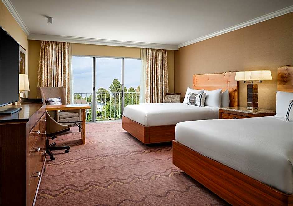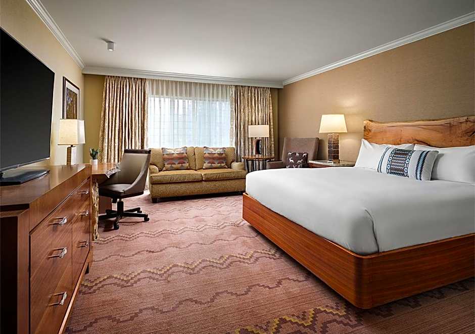 Grand View One King Bed with Sofa Sleeper provides one king bed featuring plush down bedding and a fold out sofa. Walk out balconies overlook our private Ponderosa pine forest, pool area or courtyard. Our exceptional remodel includes warm earth tones, Spanish wood tile entries, luxurious wool carpet, and live edge maple headboard and desks. Spacious bathrooms offer full-length double mirrors, Spanish tile shower, and seperate dressing and bath areas featuring granite vanities. Grand View One King Bed with Sofa Sleeper Room is complete with a 55" LG Flat Screen LED TV, CubieBlue Charging Alarm Clock with Bluetooth Speaker, comfortable seating area, Keurig Coffee Maker, refrigerator, personal safe, hair dryer, iron, and ironing board.