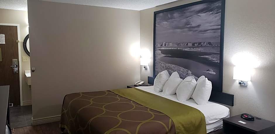 room was quite spacious and has everything you'd expect to find in a Super 8. I was pleasantly surprised to see a full size microwave and larger mini fridge in the room. Another thing is the water pressure in the shower was very strong! There were security cameras in all the hallways as well as the parking lot so I felt very safe.
