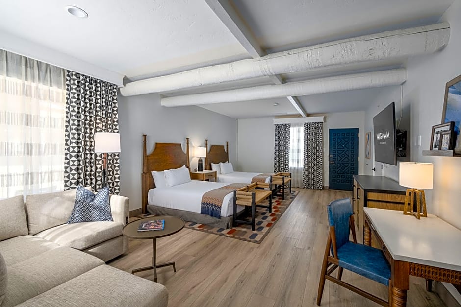 У The Wigwam ваше комфорт і відпочинок — найважливіше. Кожен номер з кондиціонером ретельно оформлений з красивими елементами з Adobe, створюючи затишну та привітну атмосферу. З різноманіттям типів номерів, включаючи делюкс-квартири з двома ліжками, квартири з терасою та люкси з великим ліжком, ви знайдете ідеальний простір для відпочинку після дня досліджень парку Літчфілд. Кожен номер обладнаний сучасними зручностями, такими як безкоштовні туалетні приналежності та приватна ванна кімната з ванною. Чи подорожуєте ви з родиною, чи насолоджуєтеся романтичним відпочинком, The Wigwam має ідеальний варіант проживання для вас.