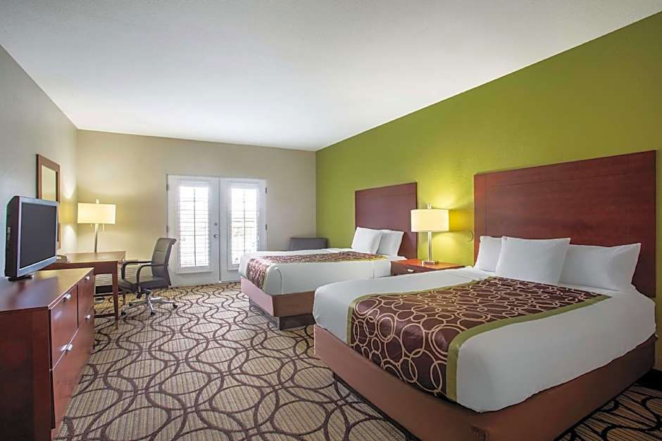 The types of rooms available at La Quinta by Wyndham Conference Center Prescott include the Suite with Two Queen Beds, Queen Room with Two Queen Beds (Disability Access and Pet Friendly on 1st floor only), King Suite (Pet Friendly on 1st floor only), King Room (Mobility Access), Deluxe Executive King Room, Deluxe Family Room, and King Room. All rooms are non-smoking. The occupancy ranges from 2 adults and 1 child to 6 adults and 4 children. Bed sizes vary depending on the room type.