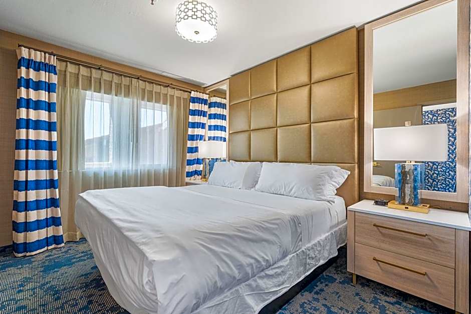 This accessible two-room suite features a 37” flat screen HDTV in the bedroom; a separate living room with a sofa bed, a roll In shower, a 42” flat screen HDTV, workspace, and a fully furnished kitchenette, including a full-size refrigerator, microwave, flat surface cooktop, and a coffee maker.