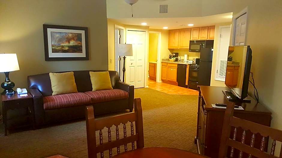 This spacious two-bedroom resort suite measures approximately 1,224 square feet. You will enjoy one king bed in the master bedroom, two double beds in the guest bedroom and one queen sleeper sofa in the living room. additional amenities include two bathrooms, whirlpool tub, full kitchen and dining area, washer/dryer, and balcony. Maximum occupancy is six. Private sleeping area sleeps four.