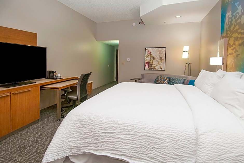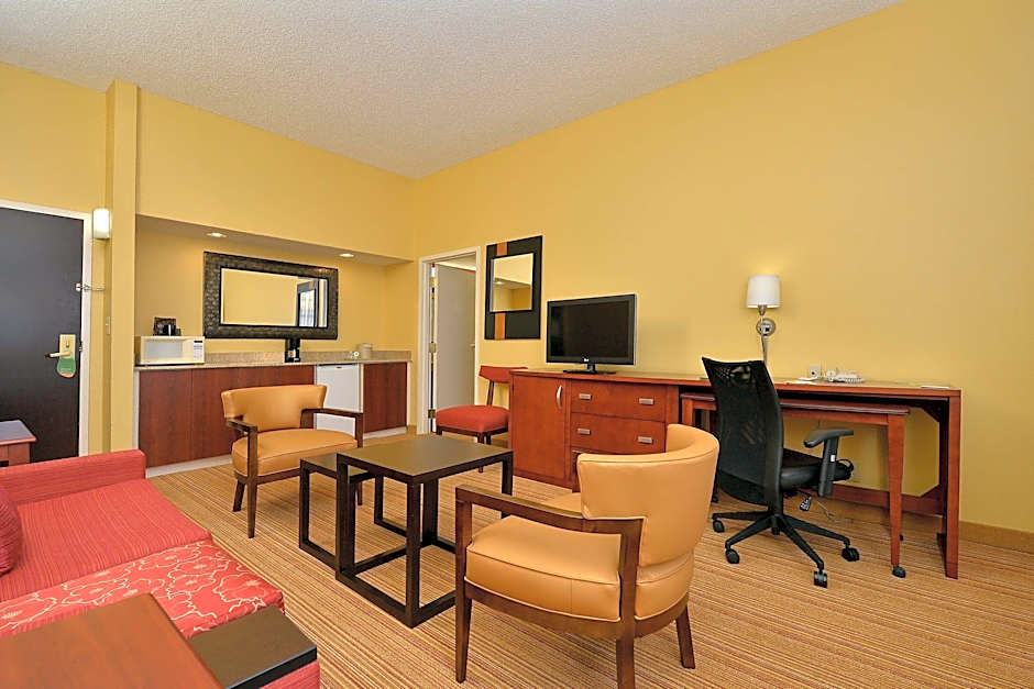 Great room. Very large TV. Comfortable bed. AC worked great. Has a coffee maker, fridge, and microwave. There is a small sofa with ottoman. It has a table that rolls out from under the desk. Great staff. Exercise room looked great.