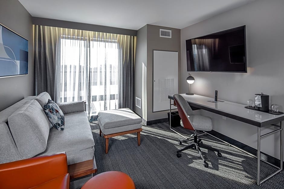New hotel that is modern & clean. Rooms have the bed facing a different direction which was a nice surprise and made the room feel larger. Large outdoor patio area with fire pit, private booths inside with your own TV in the restaurant