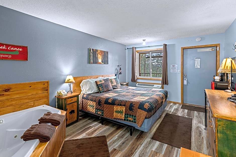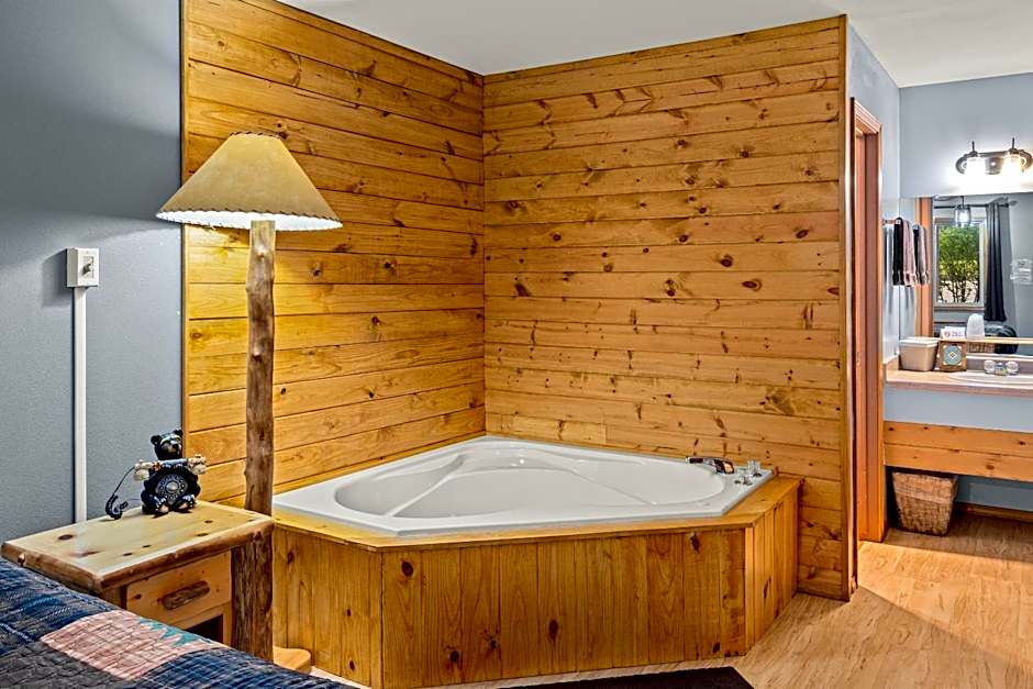This place was amazing!!! It is quaint and woodsy, with a cute bear theme. The rooms were exceptionally clean. The jacuzzi in the room was perfect and clean. The large semi-outdoor seating area hangout spot on the first floor was sooooo great. It is plexiglassed in but has an opening at the top to let heat out and it has large ceiling fans. It was very comfortable for quiet talk late night outside our room (#14). Smoking is allowed in that area, but there is also room to spread out and the roof is so tall and the breezeway has constant movement of air, so the smoking was not very noticeable or disruptive. The staff was very friendly. The shared hot tub area did look like it had been thoroughly trashed the night before when we went to check it out before we left around 11. I would have liked to see it cleaner in case we wanted an early morning hot tub soak with a nature view, but it didn’t mess up our day because we already had the huge jacuzzi tub in the room anyway. The forest view rooms on the back of the building do have a very serene feel when you walk by them and see the forest and steep hill down below. Feels like you’re very secluded. The front of the hotel is clearly not as secluded with a parking lot view and close to the street, but the windows are newer and very quiet. The blackout curtains are top notch. We couldn’t see anything in or out of our room at anytime with them drawn closed. We could not even see a glimpse into any other room, unlike in many other motel-style places. I never heard any movement in rooms below or around us even though the place was fairly well booked during our stay. The inside of rooms look exactly as shown on the website. The staff was friendly and kind. Easy check on.