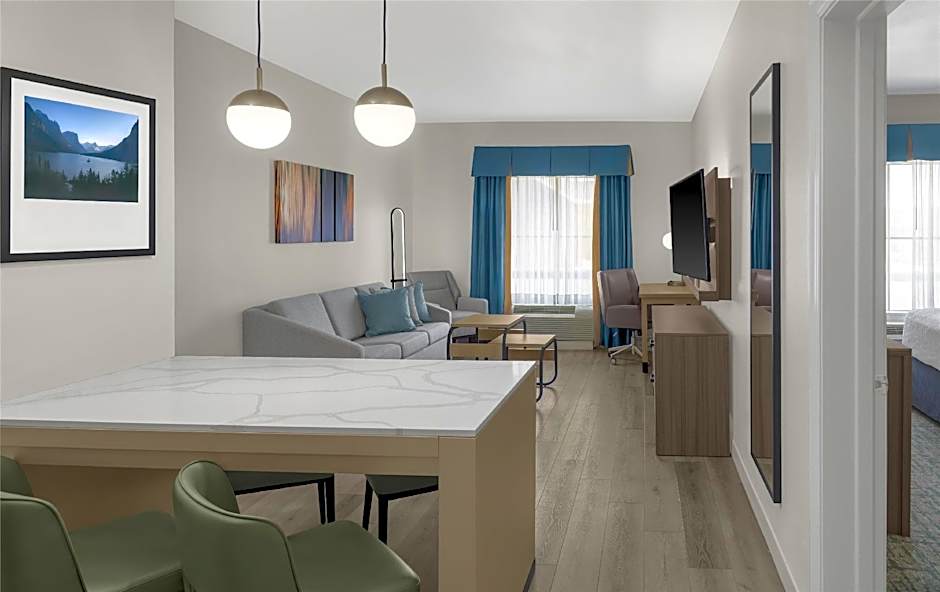 Separate living area, sofa bed, fully equipped kitchen, two TVs, internet access This 1 bedroom suite is filled with all the comforts of home including a bedroom with 2 queen-sized beds and a separate living room with a sofa bed. A fully equipped kitchen includes a full-sized refrigerator, microwave, dishwasher and twin burner stove, utensils, and a dining table to make dining in easy. For your entertainment there is two TV's and complimentary internet access.