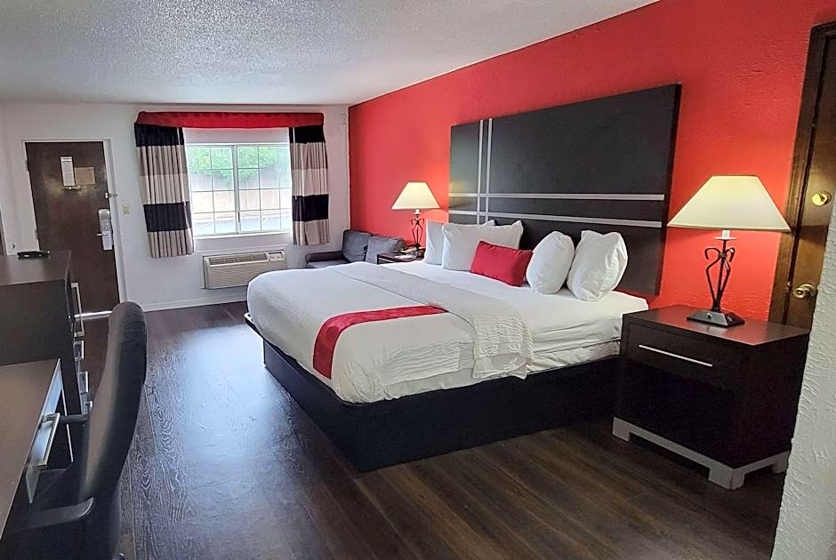 The Ramada by Wyndham Mountain Home hotel offers a variety of room types. These include Queen Rooms with Two Queen Beds, Deluxe King Rooms, King Suites with Jetted Tub and Pool View/Access, King Rooms, Queen Rooms, Efficiency Rooms, and King Studio Suites. All rooms are non-smoking and have a room size of 334 square feet. The occupancy ranges from 2 adults and 1 child to 4 adults and 3 children, depending on the room type, and the bed sizes include Queen, King, and Bunk beds.