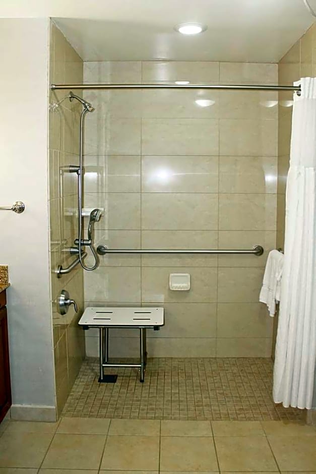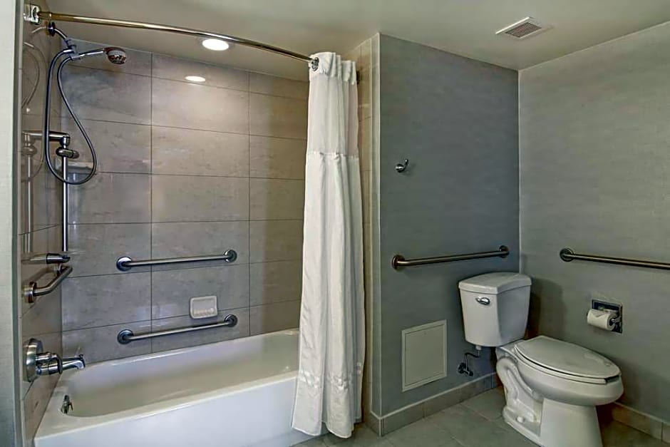 This mobility accessible non-smoking one bedroom suite features one king-sized bed, and an accessible bathtub. This suite has a kitchen, built to lower scale, is fully equipped down to utensils; and includes a full-sized refrigerator, microwave, dishwasher and twin burner stove. The dining area can easily double as workspace. This suite provides a private bedroom with a 37-inch HDTV and a separate living area features a full-sized sofa bed, chair and HDTV. All of our suites keep you connected with complimentary high-speed internet access, telephone, and alarm clock with MP3 player capabilities and pre-set local radio stations. Any corresponding photo may not reflect the specific accessible room type or room feature.
