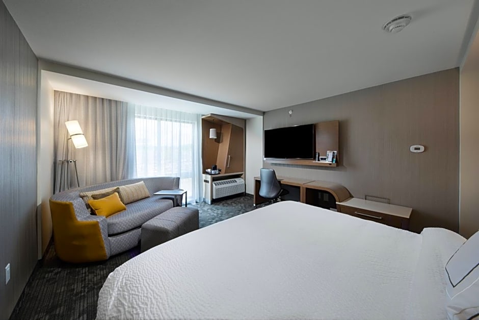 The Courtyard by Marriott Russellville offers a Double Queen Room which has a room size of 377 sqft, accommodates 4 adults, and has 1 King size bed and 1 Sofa Bed. They also have a King Room with Sofa Bed - Hearing Accessible, accommodating 3 adults, with 1 King size bed and 1 Sofa Bed. Additionally, they have a King Room with Sofa Bed which has a room size of 334 sqft, accommodates 3 adults, and has 1 King size bed. Smoking is not allowed in any of these rooms.