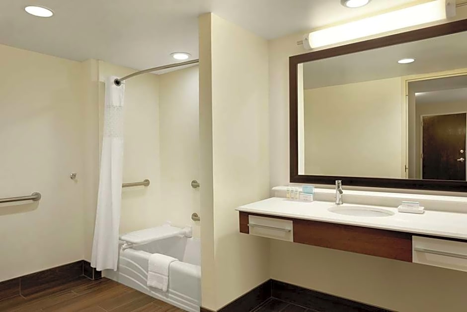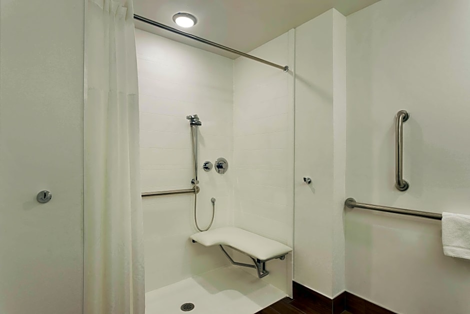 Any corresponding photo may not reflect the specific accessible room type or room feature. This mobility and hearing accessible, two-room, nonsmoking suite features one king sized bed , and an accessible bath tub. The suite also has a visual alarm and notification devices for the doorbell or door knock and incoming phone calls. The room features include a full kitchen, comfortable soft seating, a HDTV, and easy to operate alarm clock/radio. The free high speed internet access will help you stay connected while on the road. If you prefer not to work at the desk, you can use the convenient lapdesk instead. You'll also enjoy the convenience of having a coffee maker with tea service and iron/ironing board in your room.