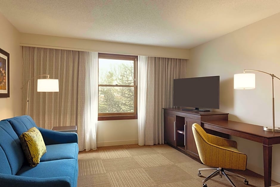 32-inch HDTV, free WiFi access, kitchen, workspace, lounge chair, coffeemaker Settle into this spacious two room non-smoking suite which contains one king-sized clean and fresh Hampton bed®, a kitchen and soft seating area with a plush sofa. Relax in the easy chair and watch a movie on the 32-inch HDTV or catch up on work at the desk with free WiFi access. Savor a freshly brewed coffee from the coffeemaker provided. The bathroom provides fluffy towels, a shower with WaterPik showerhead and curved shower rod for extra light and space in the shower.