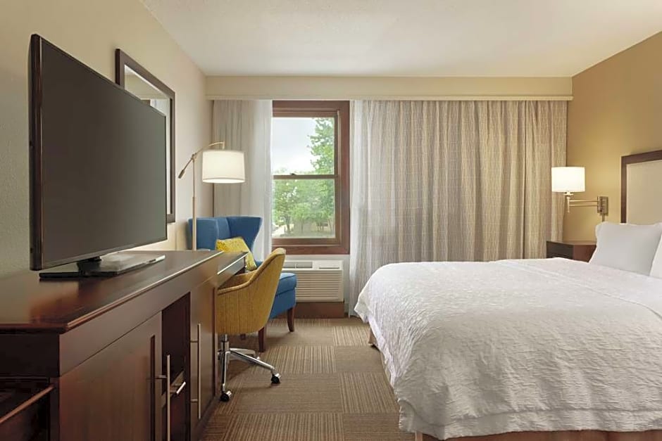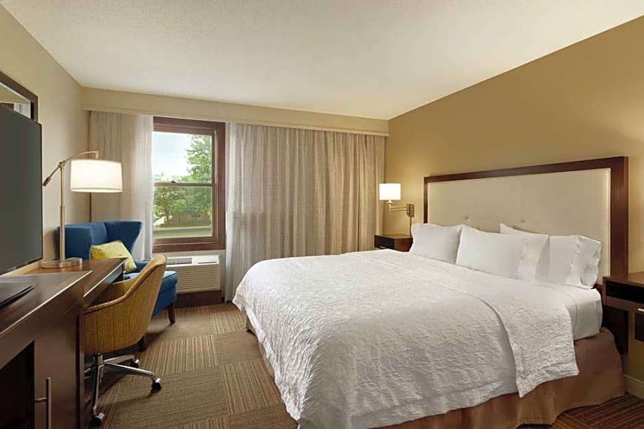 32-inch HDTV, free WiFi access, easy chair & ottoman, large work desk, coffeemaker Enjoy a restful stay in this spacious non-smoking room which features one king-sized clean and fresh Hampton bed® and an easy chair with ottoman. Relax in front of the 32-inch HDTV or work at the desk and stay connected with free WiFi access. Savor a freshly brewed coffee from the coffeemaker provided. The bathroom provides fluffy towels, a shower with WaterPik showerhead and curved shower rod for extra light and space in the shower.