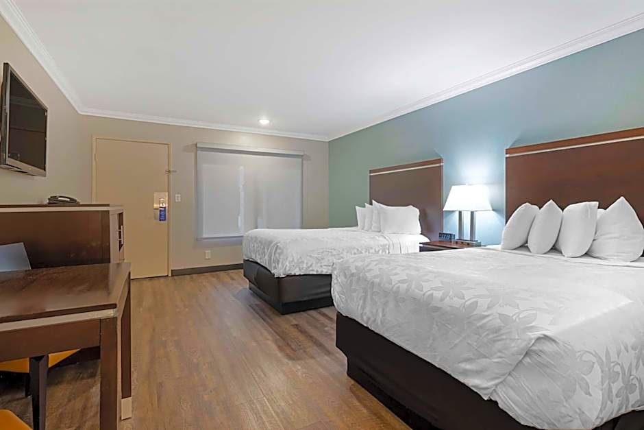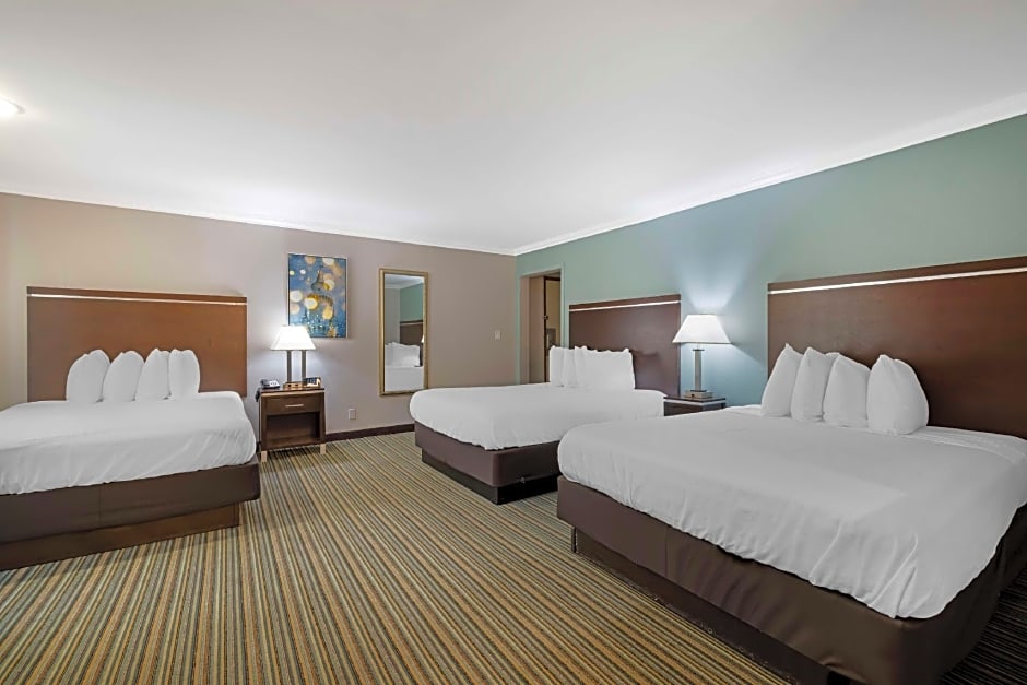 The Best Western Courtesy Inn - Anaheim Park Hotel offers a variety of room types. They have double rooms with two double beds, king rooms, queen rooms with two queen beds, deluxe queen rooms with two queen beds, and family rooms. All rooms are non-smoking and can accommodate either 4 adults and 3 children or 6 adults and 4 children, depending on the room type. The beds range from double beds to queen beds, with a king size bed in the king rooms.