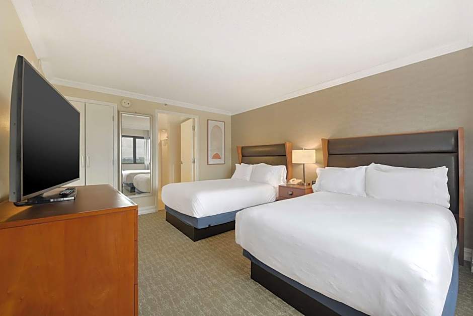 The Embassy Suites by Hilton Anaheim-Orange offers a variety of suite options with a room size of 355 sqft. All rooms are non-smoking. The suites can accommodate between 4 to 6 adults and 3 to 4 children, with bed options including double beds, king size beds, and sofa beds. Some suites also offer additional features such as a balcony and views of the theme park or stadium.