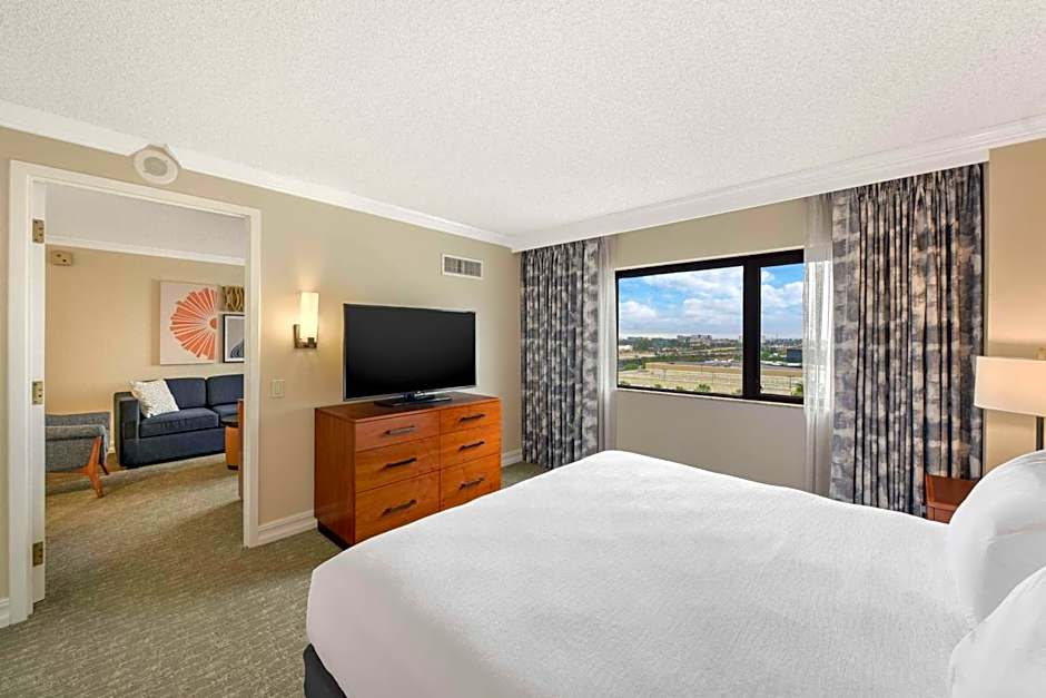 This king suite features a spacious sitting area with a wet bar, refrigerator, microwave, and coffee maker. The bathroom has dual entry and features a separate shower and tub. Amenities include a hairdryer and toiletries. A 50-inch HDTV is offered in the sitting area and another in the bedroom. A safe and ironing facilities are also included.