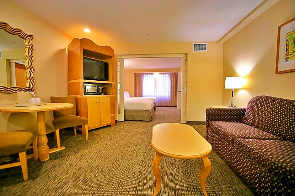 Enjoy plenty of space and comfort in our two-bedroom, allowing you to relax while in downtown Anaheim. This two-bedroom suite is perfect for friends, families or groups visiting the DISNEYLAND® Resort Parks or the Anaheim Convention Center and includes a living area separated from the bedroom by French doors, providing guests with additional space. No balconies available in suite.