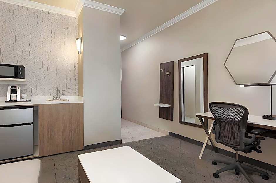 Very nice, clean hotel with a large comfortable room: king bed, couch, table, desk, refrigerator, microwave, Keurig, breakfast and more. Friendly employees and well-stocked breakfast: eggs, sausage, potatoes, biscuits, toast, waffles, cereal, oatmeal, fruit, yogurt, etc.. Thank you!’ 😊