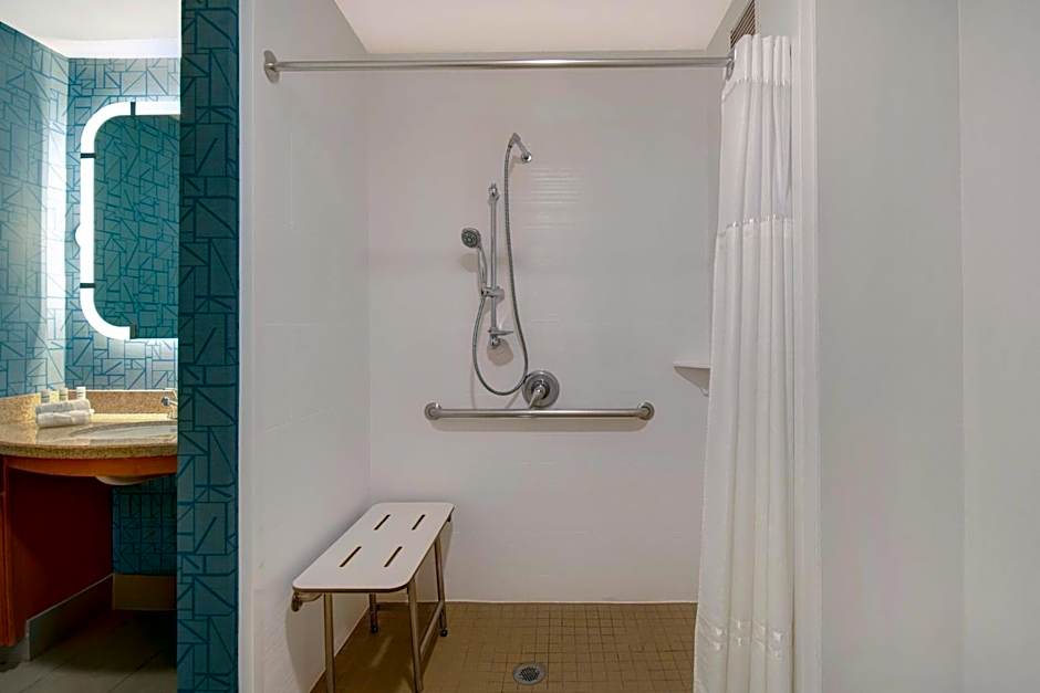 This mobility and hearing accessible suite features 1 king size bed, and a roll-in shower. This suite also has a visual alarm and notification devices for the doorbell or door knock and incoming telephone calls. This suite has a fully equipped kitchen that includes a full-sized refrigerator, microwave, dishwasher and stove.