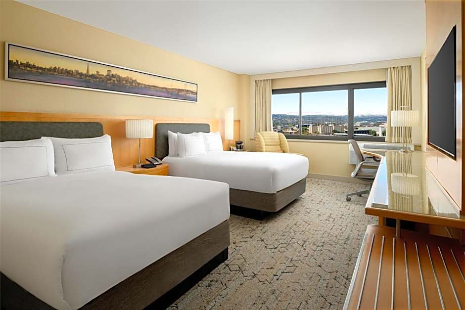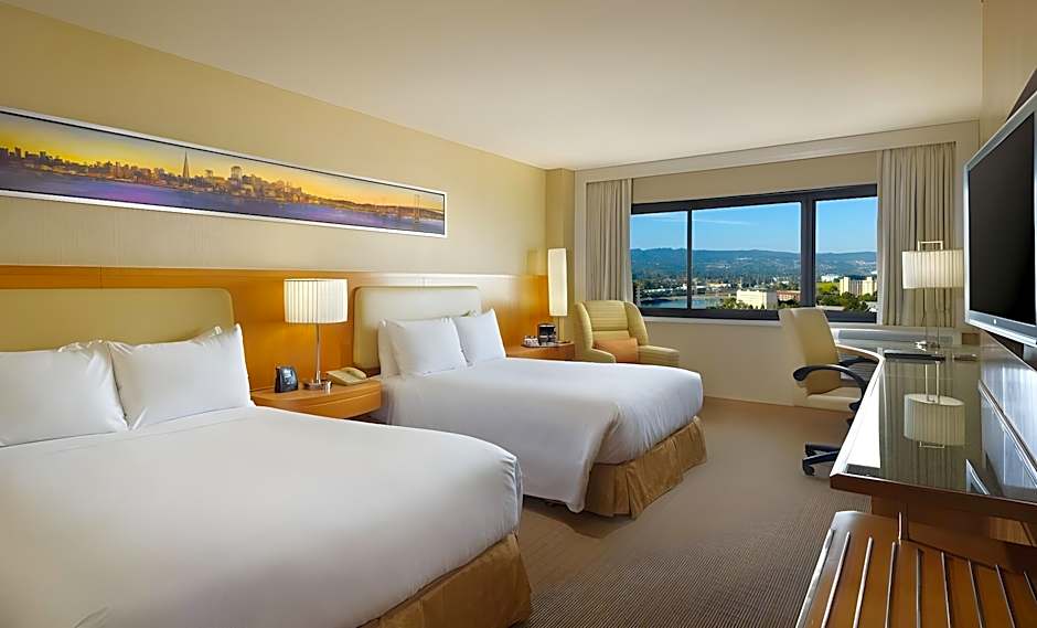 Executive Lounge access, complimentary breakfast, 42-inch HD TV, Hilton Serenity beds, WiFi This modern room offers access to the Executive Lounge overlooking the San Francisco Bay. Start your day with complimentary continental breakfast and relax in the evening with hors d'oeuvres and complimentary soft drinks. Relax in front of the 42-inch HD TV with premium channels and GuestLink system, allowing you to plug in and view digital devices on the monitor. Stay on top of work at the desk with ergonomic chair and keep up-to-date with WiFi. Special touches include bathrobes, bottled water and upgraded bathroom amenities. Room has two double beds.