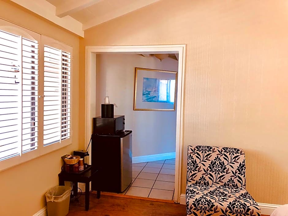 This small room features a 32-inch TV with cable channels, a refrigerator, a coffee machine with complimentary coffees and teas, a microwave, iron and ironing board, and a hair dryer.