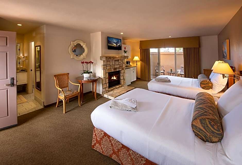 This double room features a gas-burning fireplace, refrigerator, microwave and toaster. An enclosed patio is also offered.