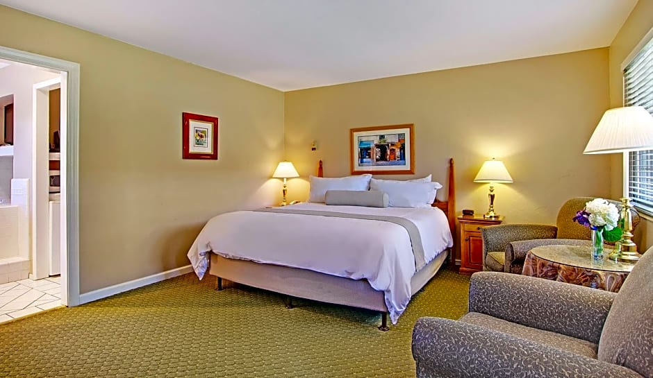 A hotel that allows pets! There is an additional daily pet fee during your stay. As you already know, Carmel is very pet/dog friendly. We went there with our pup over the 4th of July weekend. There are NO fireworks in Carmel - exactly what we wanted to keep our dog calm and relaxed. Our hotel room was spacious to move around and fit in a dog bed. The Dutch double doors were unexpected and unique (something we have never seen in our many years of travel). The Carmel weather was cool and fantastics escape from the summer heat. We did not use the jets in the large bathtubs. We loved that there was a microwave, refrigerator, and Keurig coffee. As everyone is raving about, it is always nice to come back in the afternoon to freshly baked cookies (chocolate chip, double chocolate, and oatmeal were the ones we got to try). The location is unbeatable. It's in a quiet part of town, but walk two blocks to the Main Street (Ocean Ave) to the shops and about a 10-block downhill walk to the beach. We never moved our car from the parking lot because we walked everywhere. We also rented bikes to ride along the hwy 8 and 17 Mile drive (if you ride in bikes, you don't pay the entrance fee that are charged to cars). The room was clean and the staff were friendly and helpful!