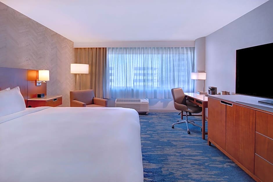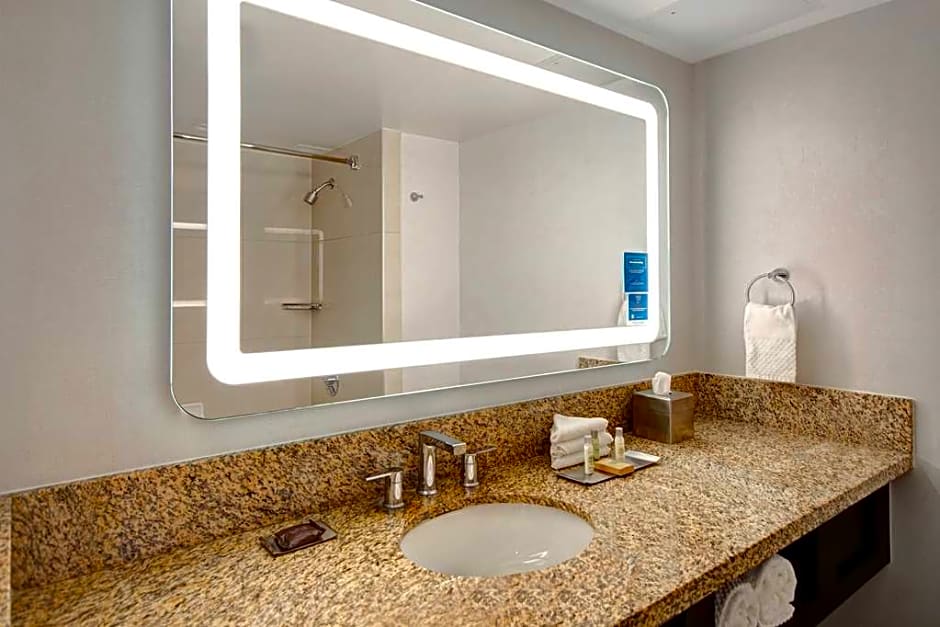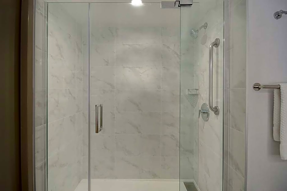 This mobility accessible standard room features one king-sized bed, and a roll-in shower. Any corresponding photo may not reflect the specific accessible room type or room feature.