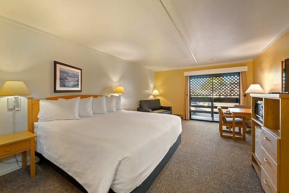 Very comfortable, nice sized room with all we needed. Our king room had a balcony and overlooked the harbor and businesses. We even saw sea lions swimming there! Just a short drive to town restaurants, headlands and beach areas. The Mendicino Botanical Gardens is just done the road. Staff was very friendly and helpful. No breakfast there but good coffee available all day. We loved this well-run hotel and will be back!