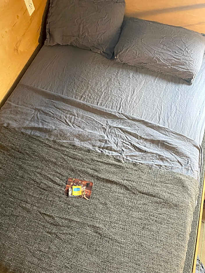 This bed in dormitory has a kitchenware, electric kettle and tea/coffee maker.