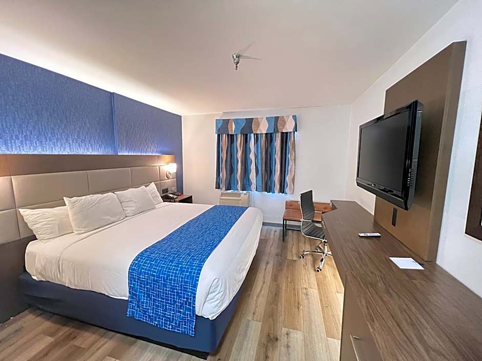 The room had plenty of space with tables, a chair, lots of storage, a big TV. WiFi was good and the included breakfast was solid -- eggs, waffle, cereal, fruit, yogurt, pastry. The main stores are just a few blocks away. There was plenty of parking (free) either outside or in a garage.