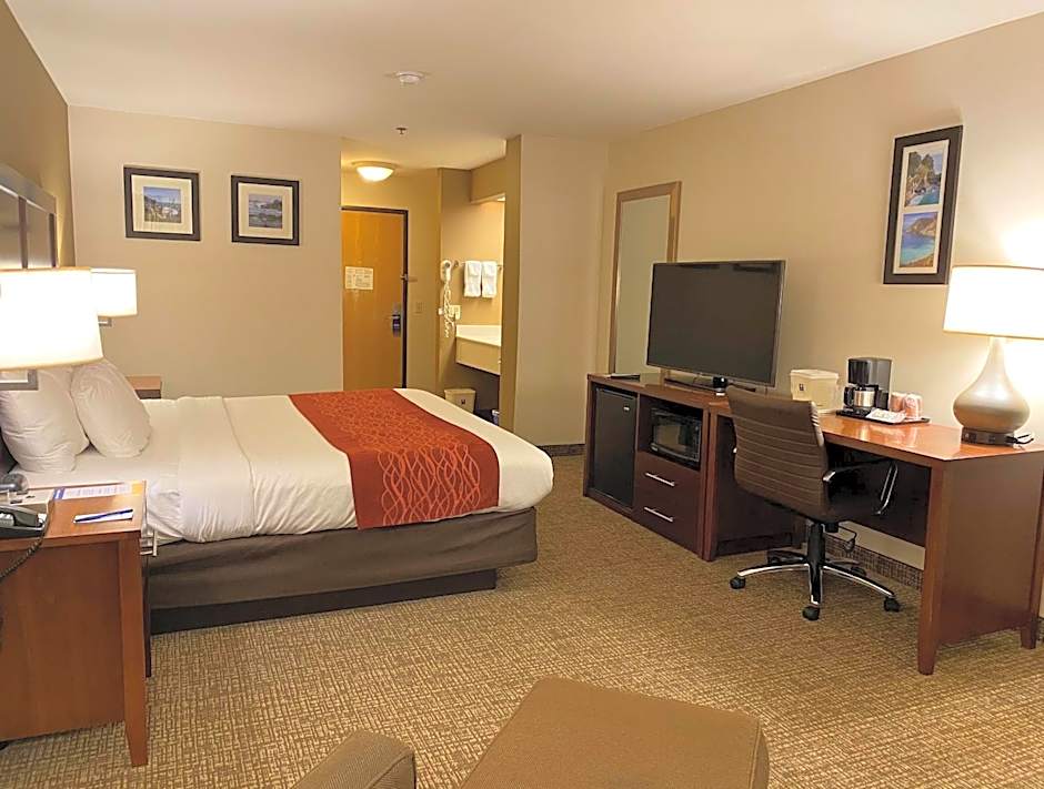 At the Comfort Inn Marina on the Monterey Bay, there are several types of rooms available. These include Standard King Rooms, Queen Suites with Two Queen Beds, King Suites, King Rooms with Roll-In Showers, King Rooms with Accessibility features, and Standard Queen Rooms with Two Queen Beds. All rooms are non-smoking and have various bed sizes. Occupancy ranges from 2 adults, 1 child to 4 adults, 3 children, and room sizes vary between 205 sqft and 398 sqft.